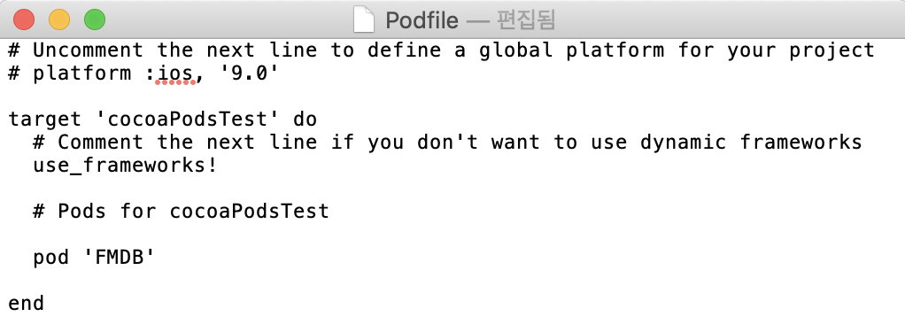 Podfile을 열어 pod 'FMDB'를 입력합니다.