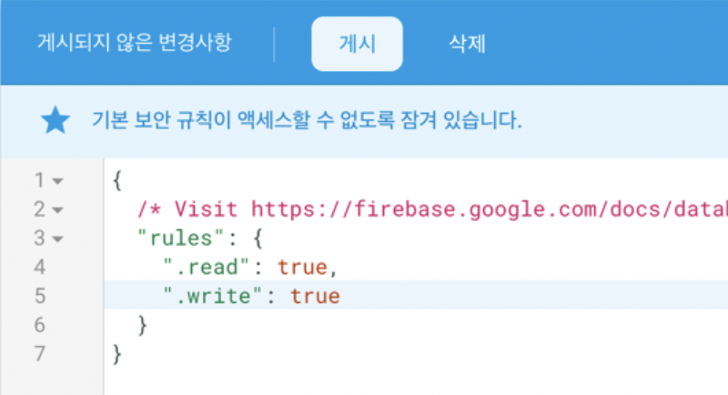 10. 마지막으로, Firebase에서 Realtime Database를 선택한 후 read와 write를 true로 바꾸어 줍니다.