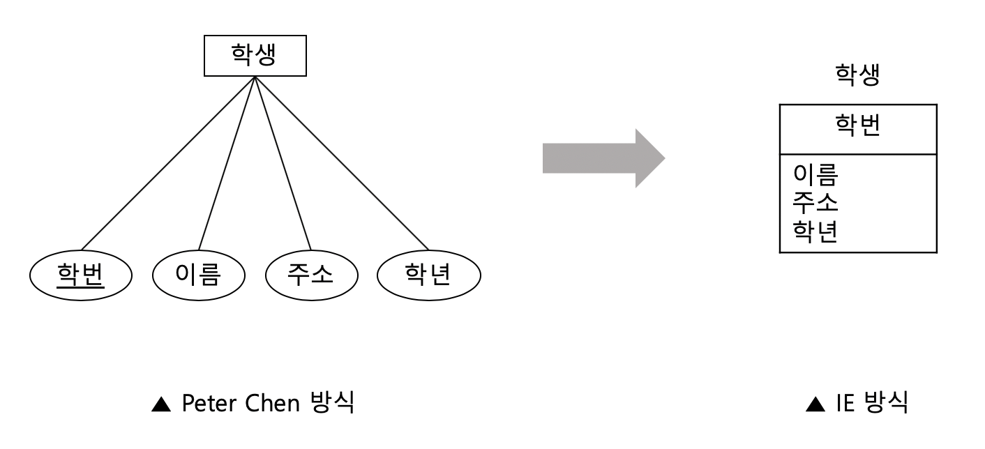 -> IE/Crow's Foot 방식에서는 개체 타입과 속성을 표(직사각형)으로 표현하며,